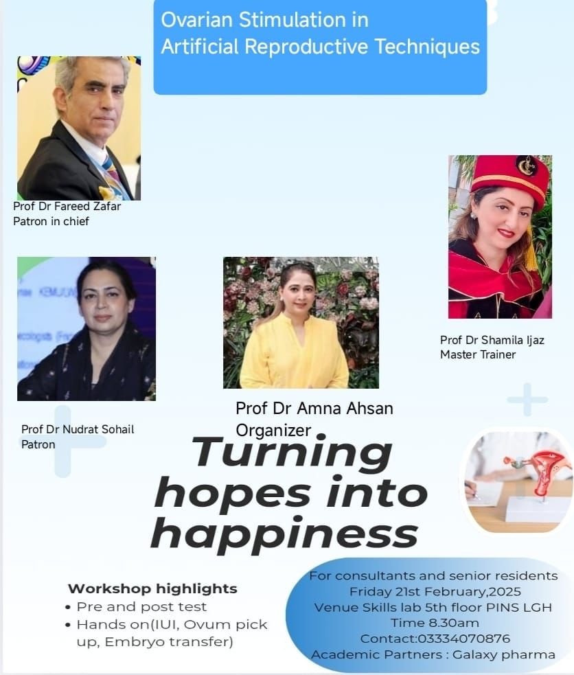 📝 Summary: Prof. Shamila Ijaz Munir led a symposium at LGH, Lahore, focusing on individualized IVF treatment. She explained ovarian reserve testing, stimulation protocols, and guided young gynecologists on embryo transfer techniques.